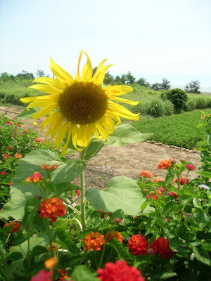 方過午的日頭,大喇喇地照射在土地上,如茵的綠草以及農田,像是要與之對抗般,堅強地展現著旺盛的生命力。顏色鮮艷的向日葵、馬纓丹,還有許多不知名的花草,亦無畏地在午后的陽光下,隨著海風的輕輔而擺動。村子盡頭的隄防外,是沒有邊際的海,以及與之相連一氣的穹蒼。